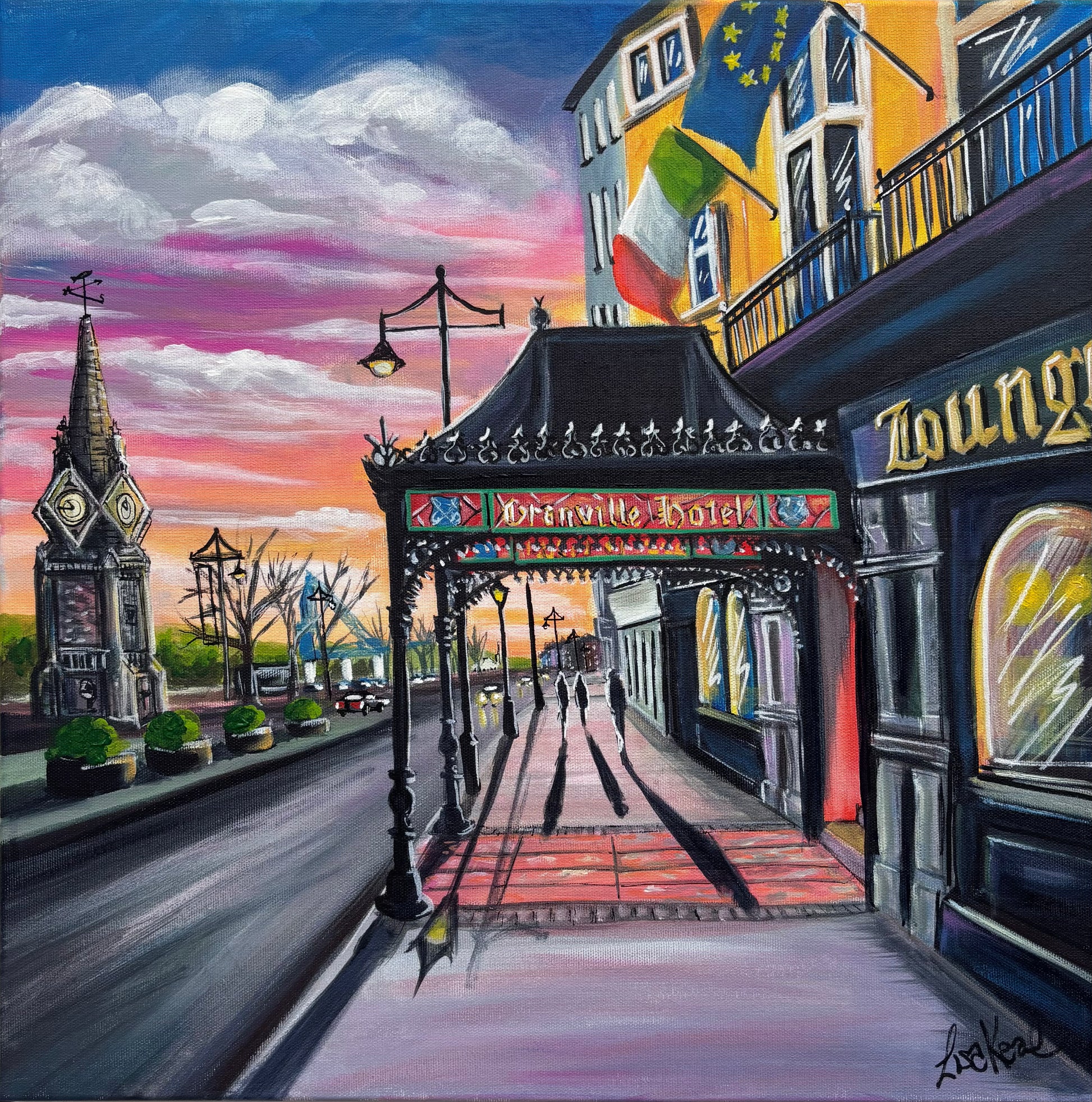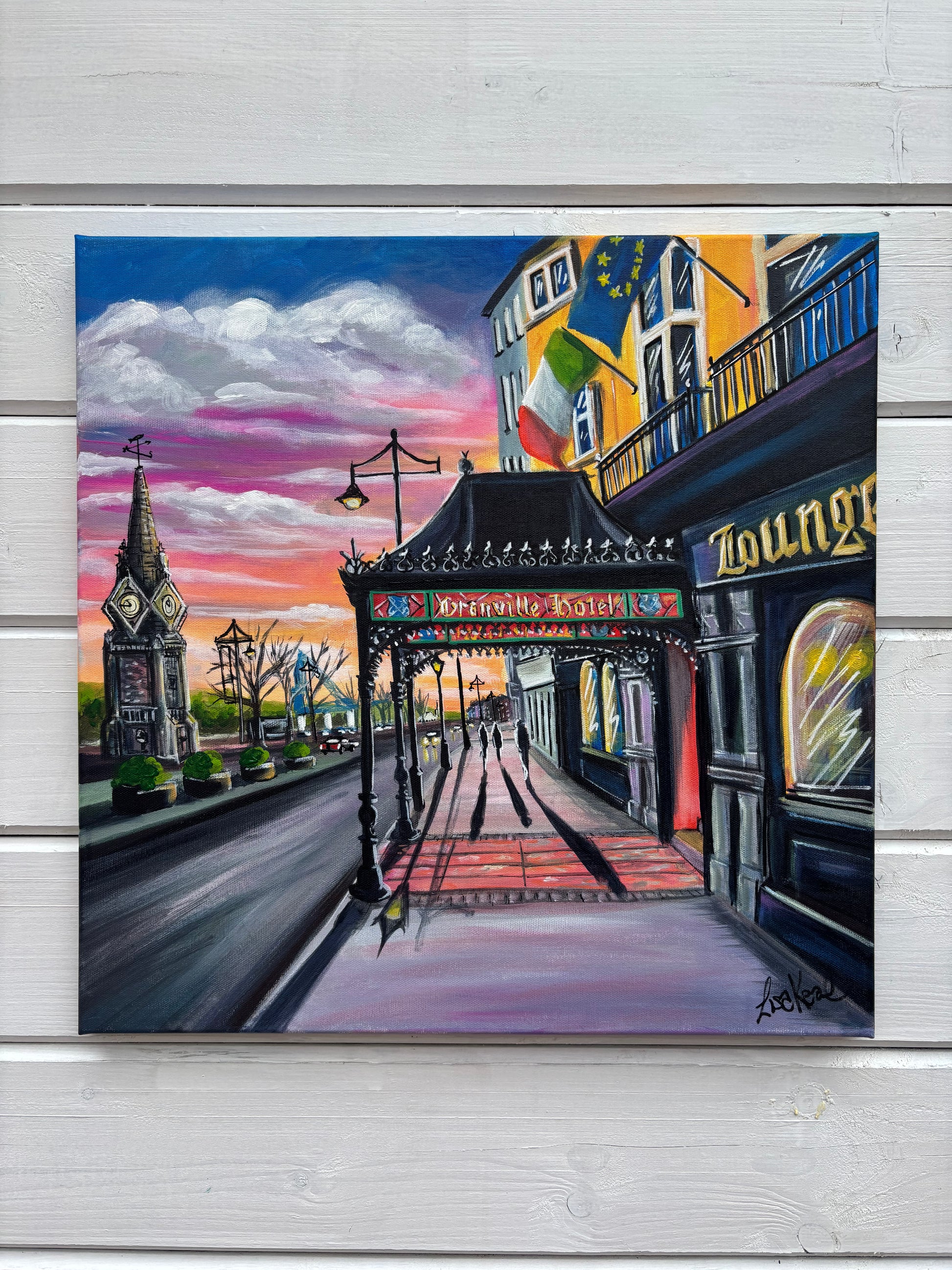 It’s been a while since I painted the Granville, this time I decided to paint it from the other direction to include the clock tower and the big crane. I love this view looking towards a setting sun with elongated shadows and a big colourful sky. Acrylic on slim canvas 50c50cm ready to hang